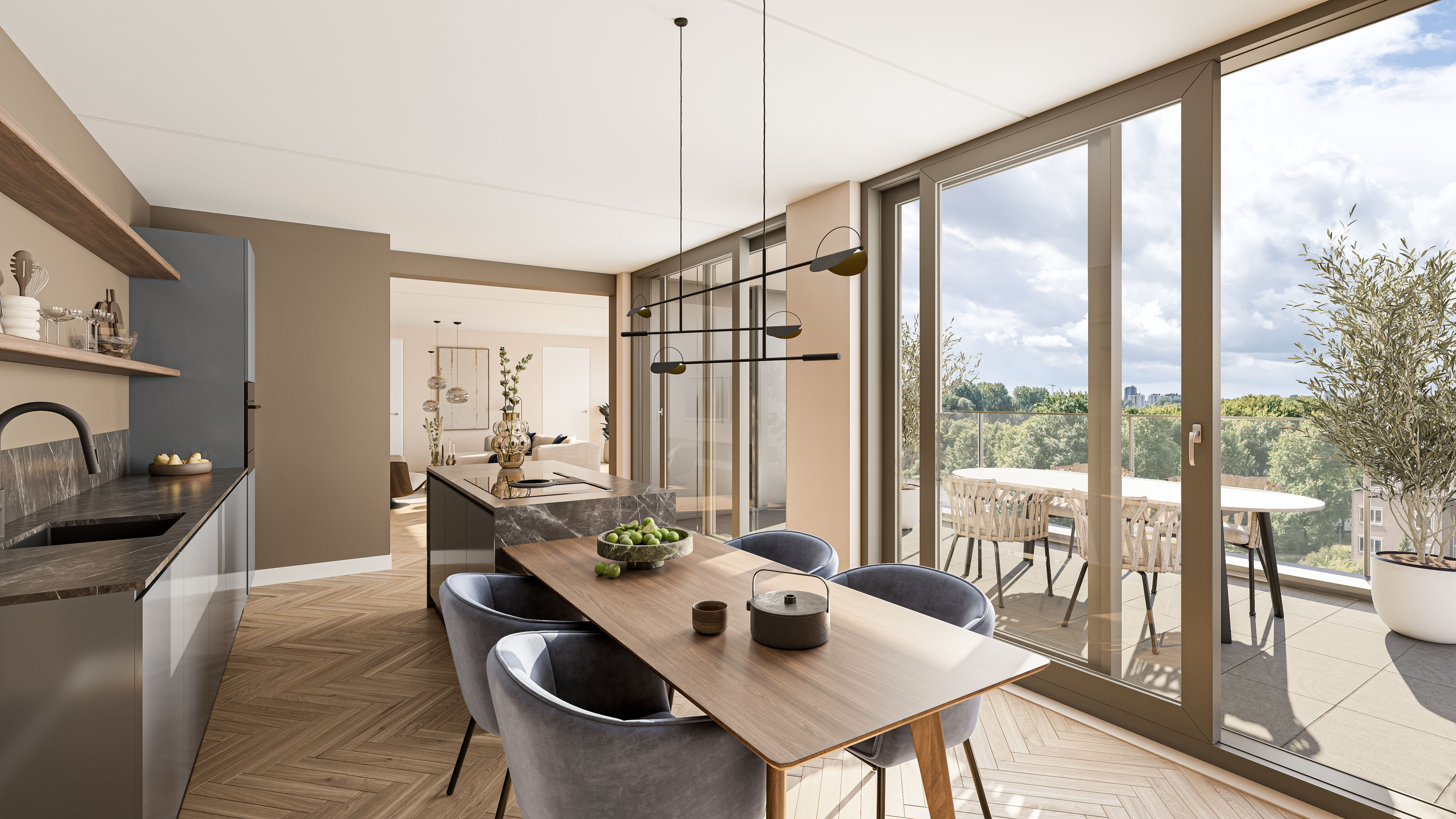 De twee Cortado Penthouses zijn het absolute kroonjuweel van het project. Hier komen ruimte, licht, luxe en privacy samen. Met ca. 160 m² woonoppervlakte, een riant dakterras van 20 m² op het zuidwesten of noordwesten én een extra terras van 5 m² aan de oostzijde geniet je de hele dag door van zon, rust en fenomenale uitzichten richting de Sloterplas en de groene binnenstraat.