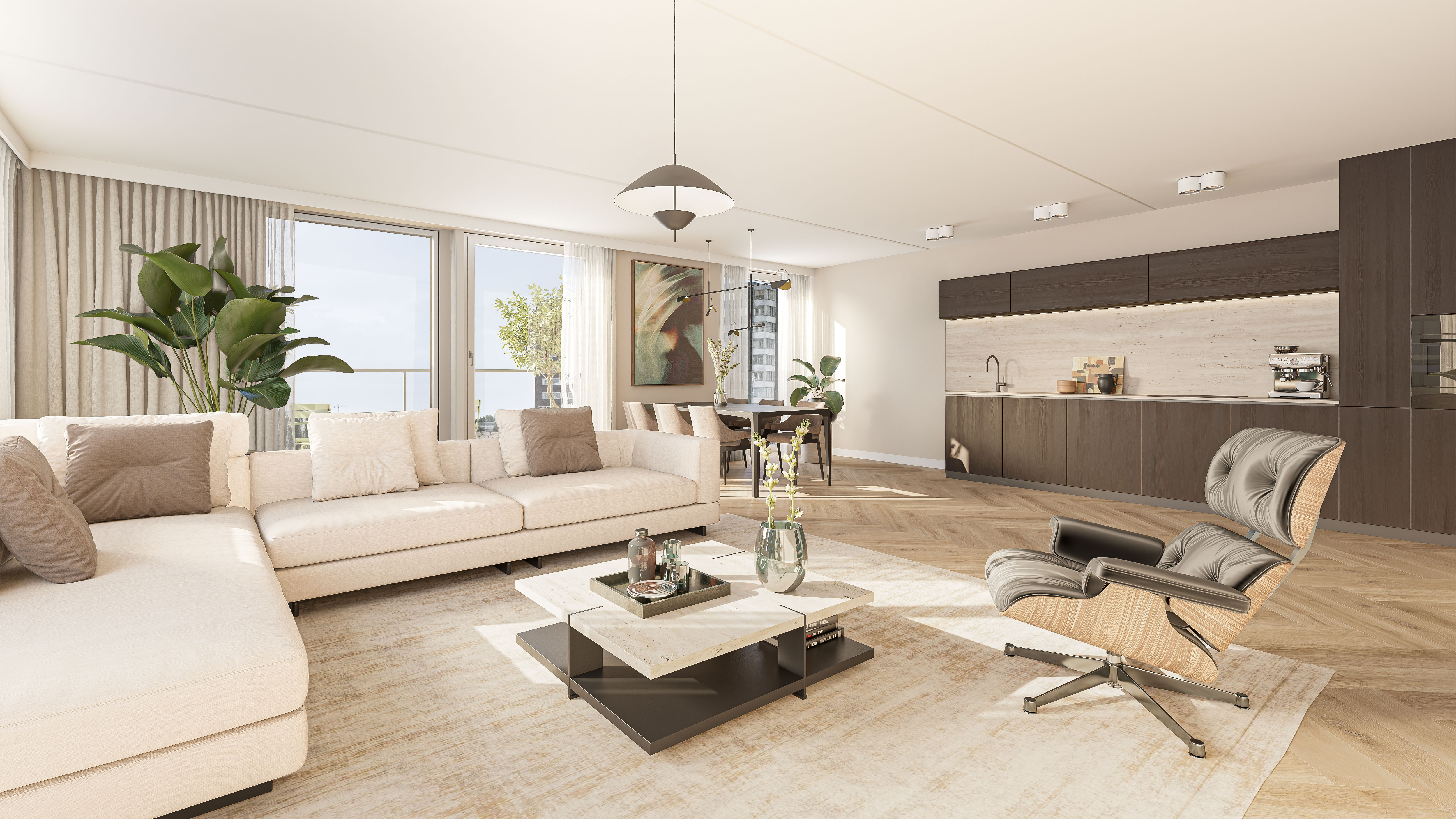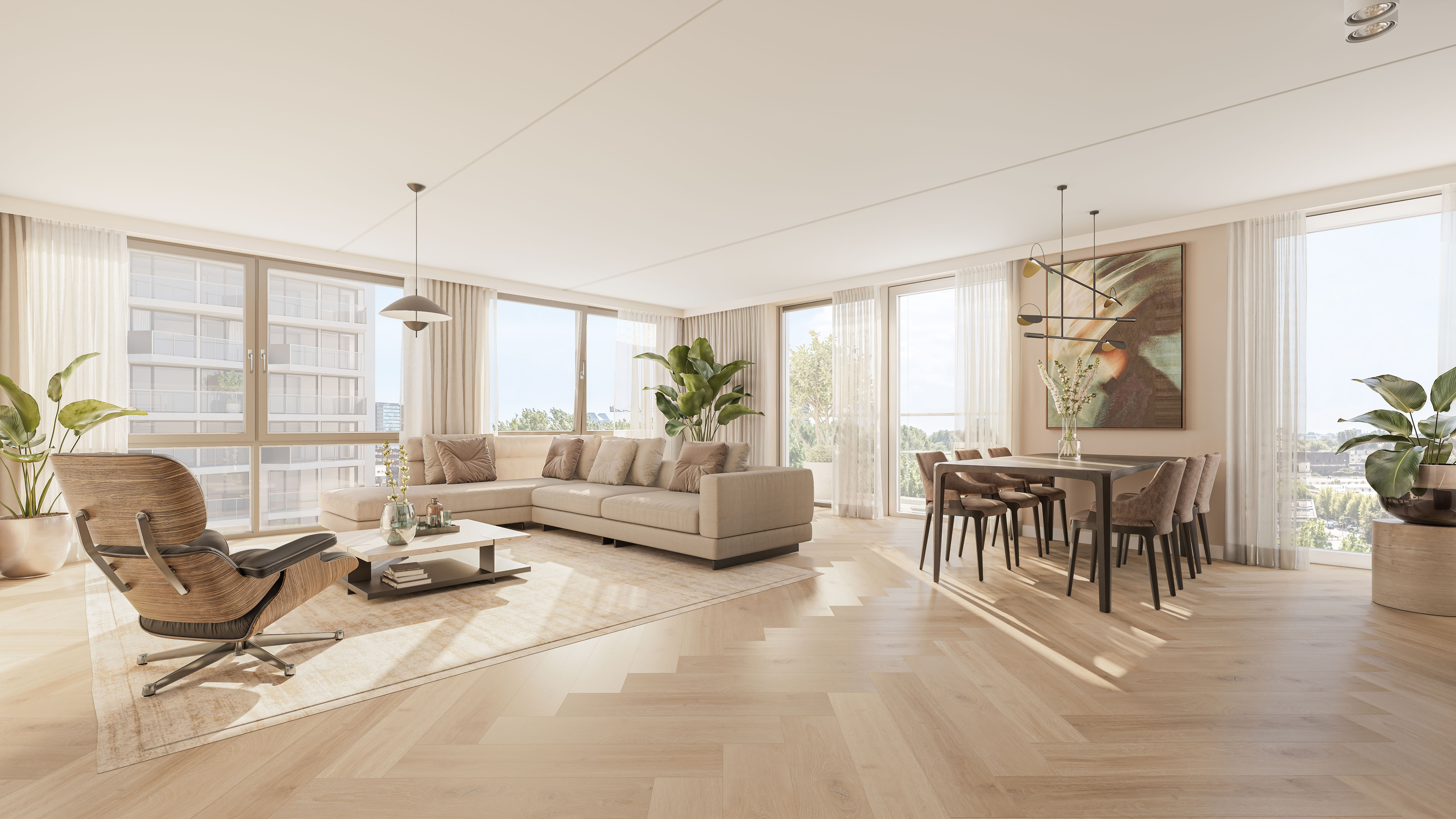 De Urban Penthouses (ca. 80 en 95 m²) liggen op de 11e verdieping en bieden een fantastisch uitzicht over de binnenstraat. Het balkon van 10 m² ligt op het zuiden (564) of noorden (565), zodat je altijd zon of juist koelte kunt kiezen.