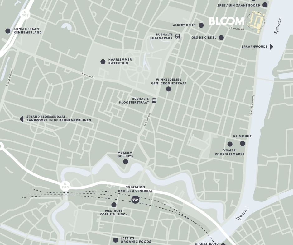 Bloom, een prachtig nieuw woongedeelte in de wijk de Indische buurt van Haarlem-Noord, gelegen aan de oostkant tegen het Spaarne aan. Hier woon je in een kindvriendelijke omgeving met alle voorzieningen binnen handbereik. Van gezellige winkels en restaurants tot uitstekende openbaar vervoersverbindingen naar Amsterdam, Leiden en Schiphol – alles is dichtbij!