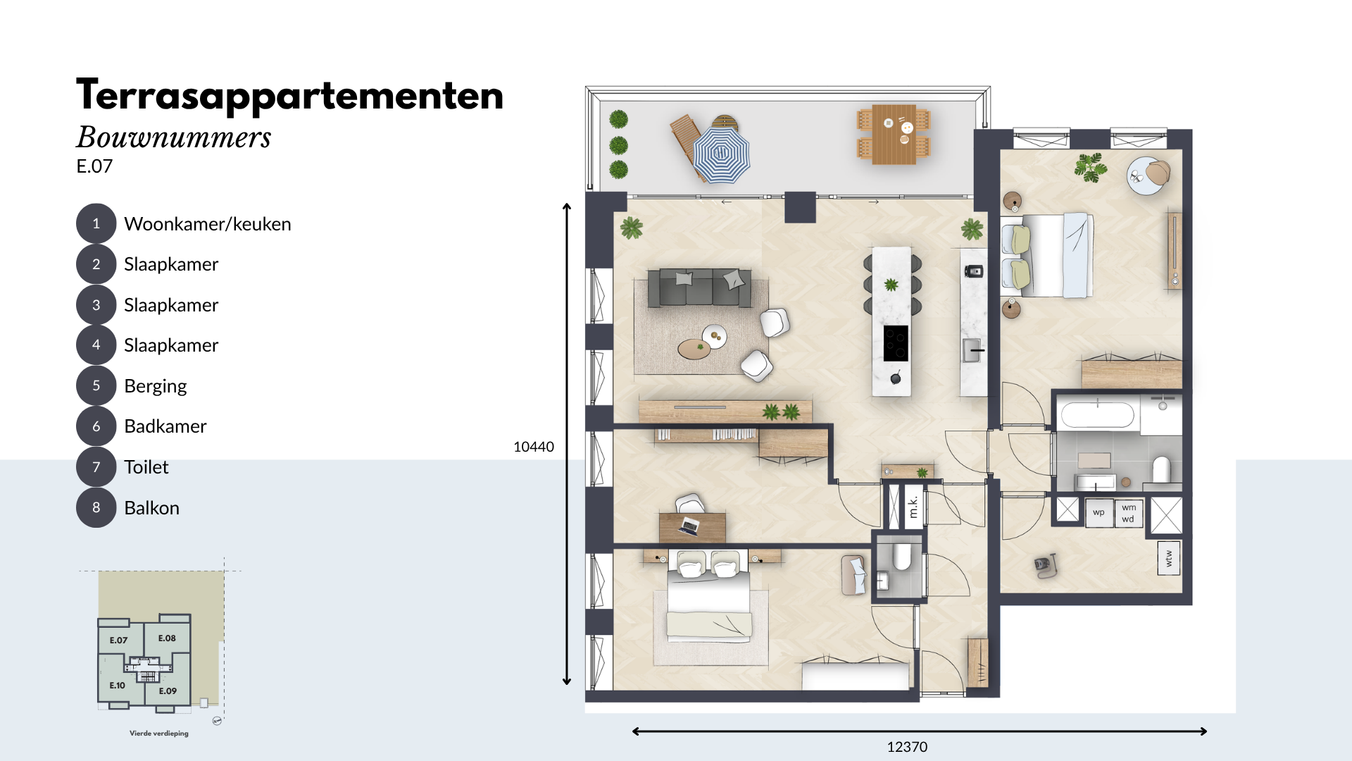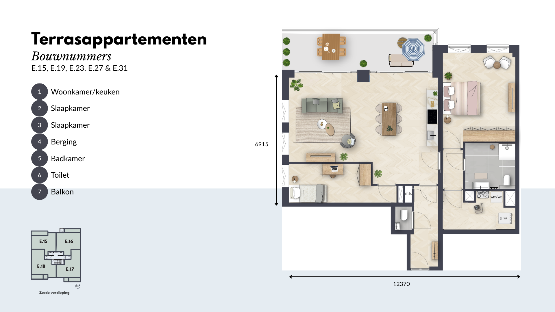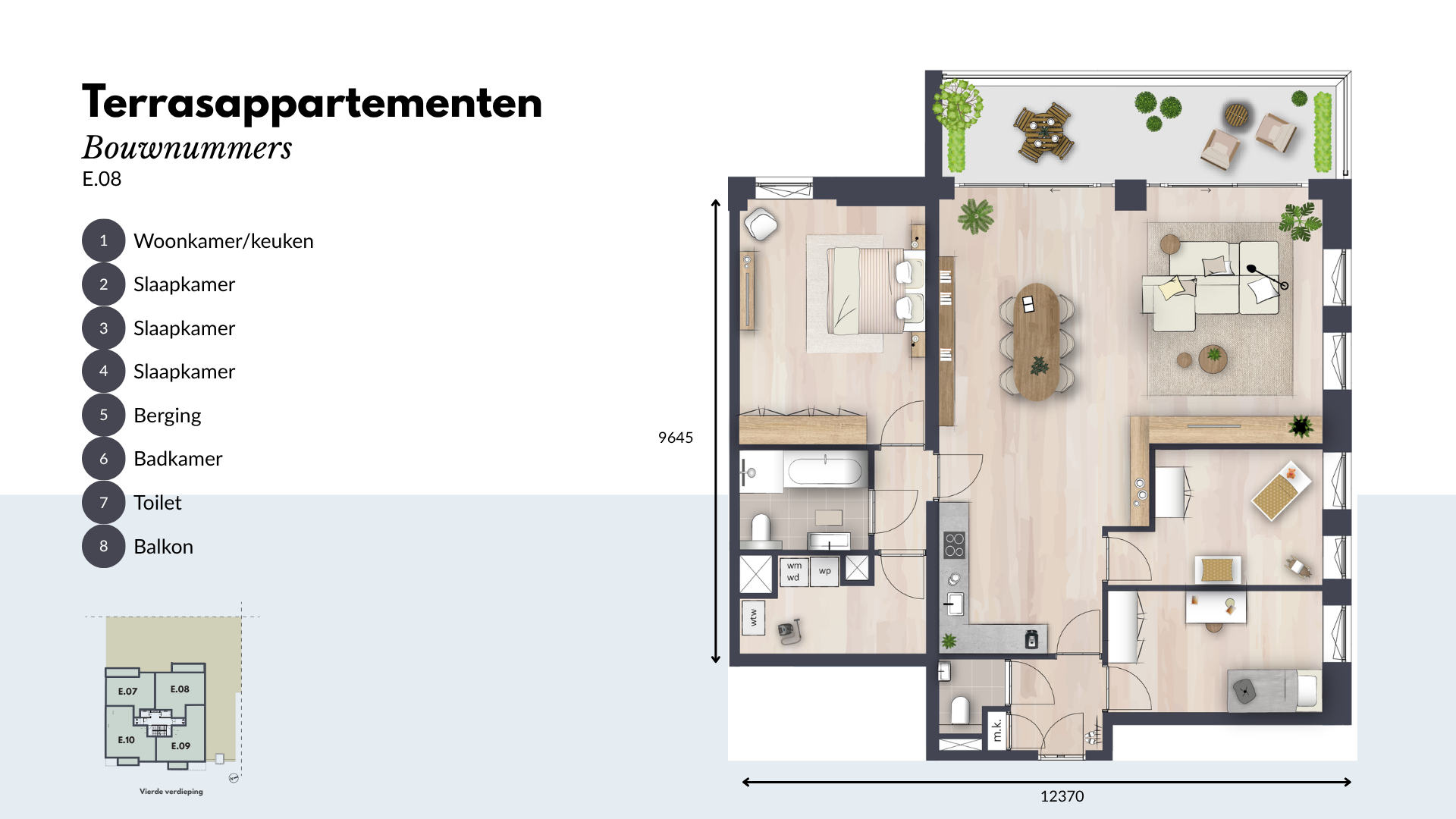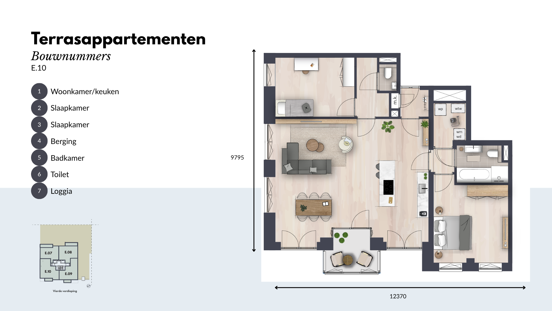 De Terrasappartementen beschikken over twee of drie ruime slaapkamers en een moderne keuken, uitgerust met hoogwaardige inbouwapparatuur. De luxe badkamer en separate toiletruimte zijn voorzien van hoogwaardig sanitair en tegelwerk. Daarnaast is er een ruime inpandige berging voor al je opslagbehoeften.