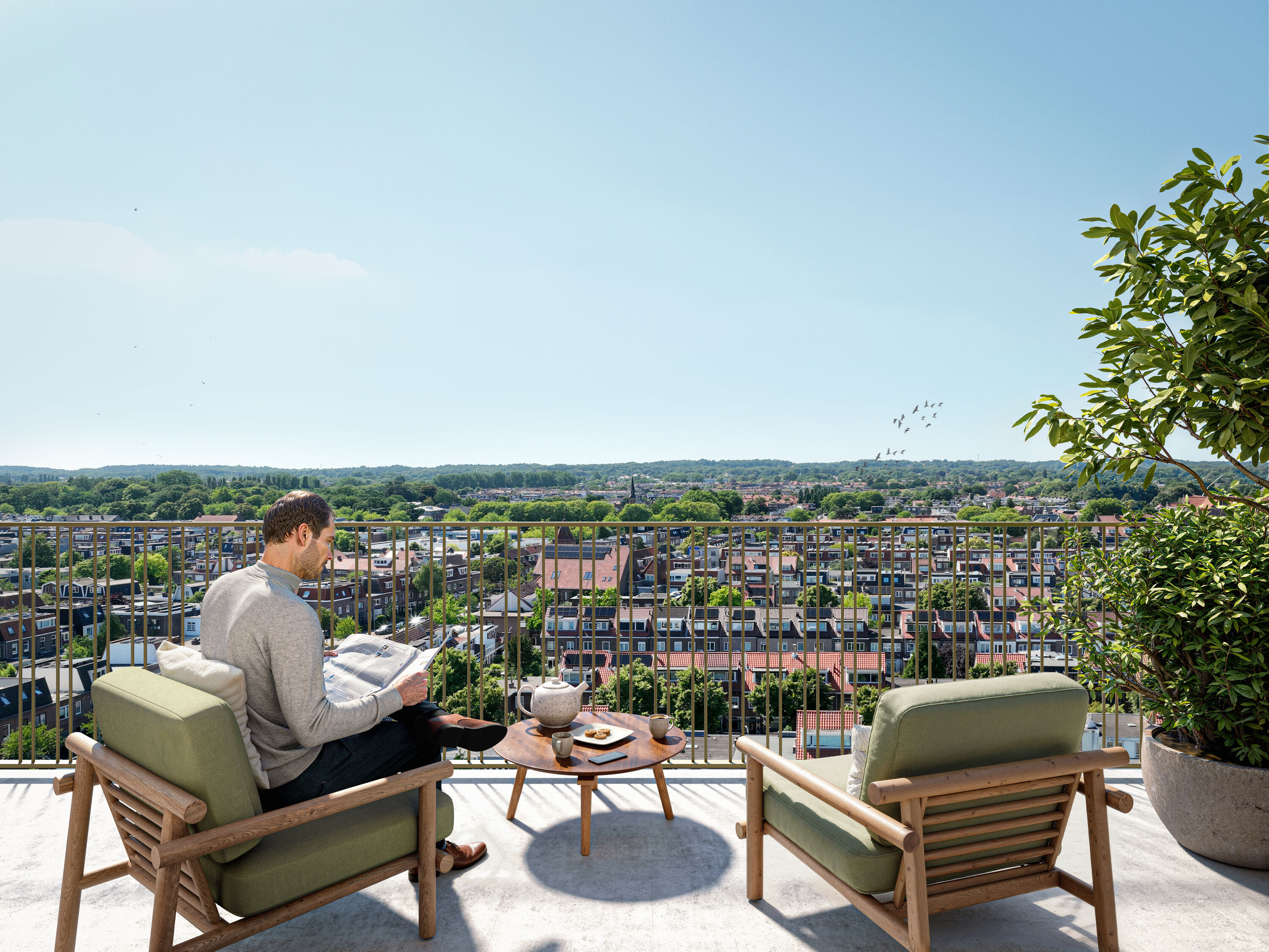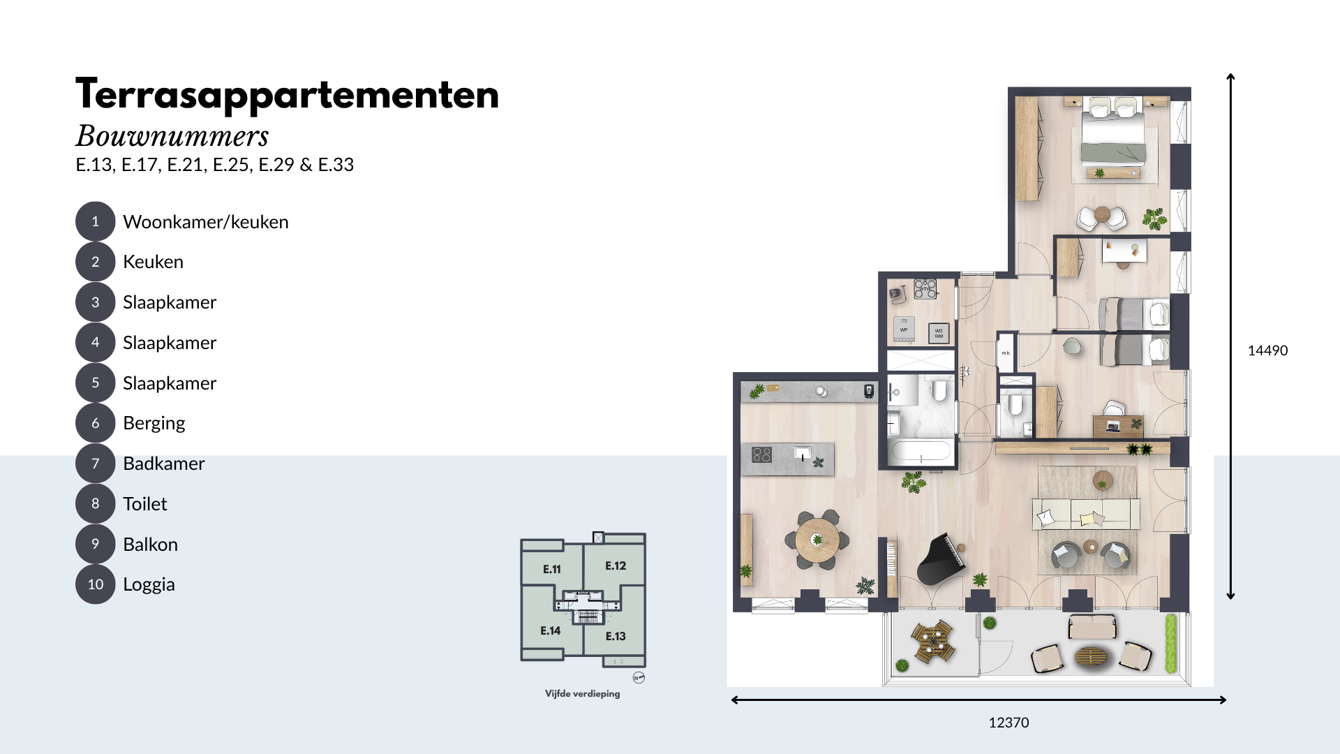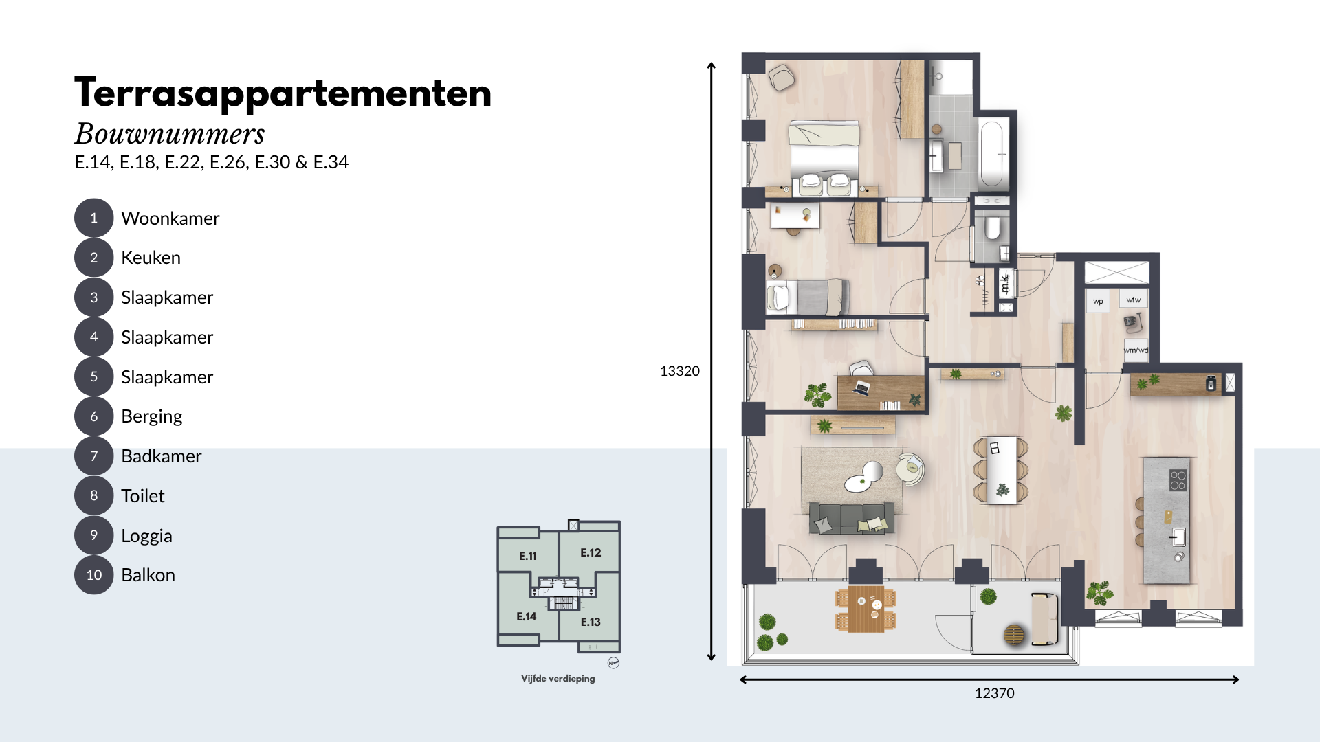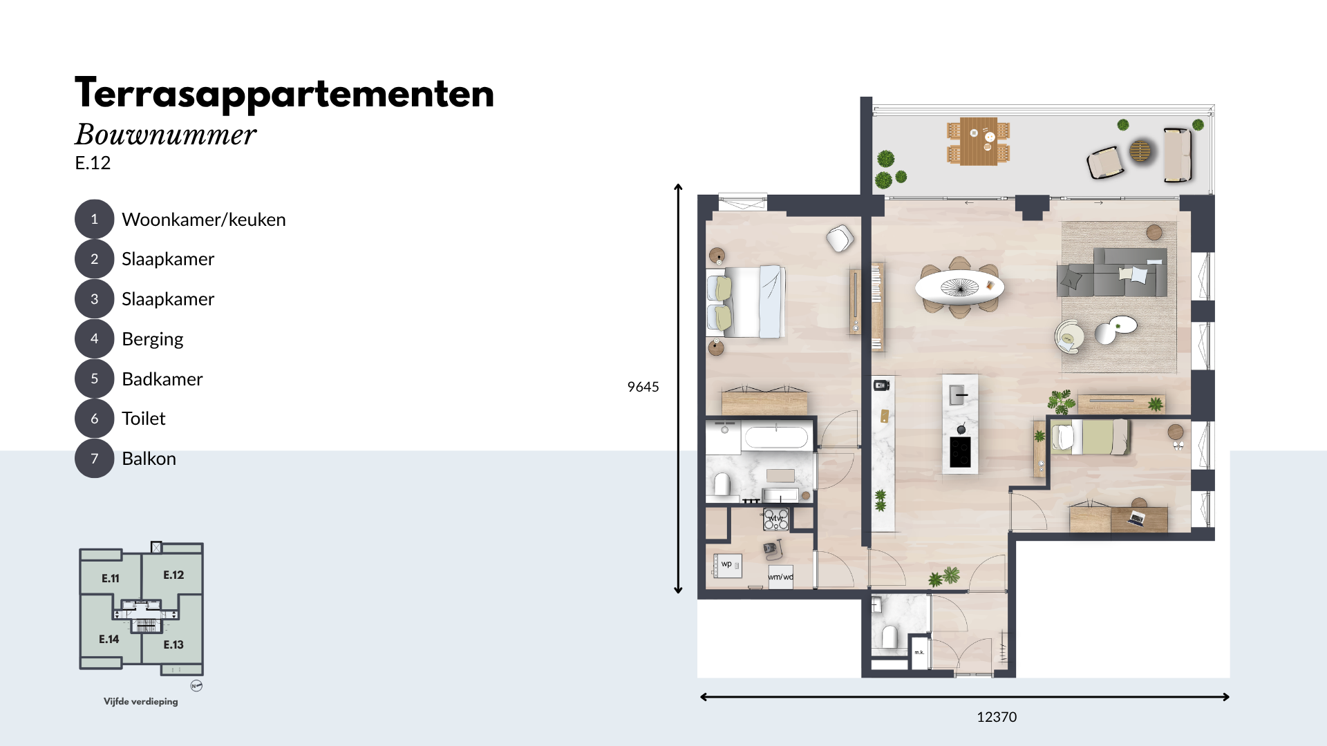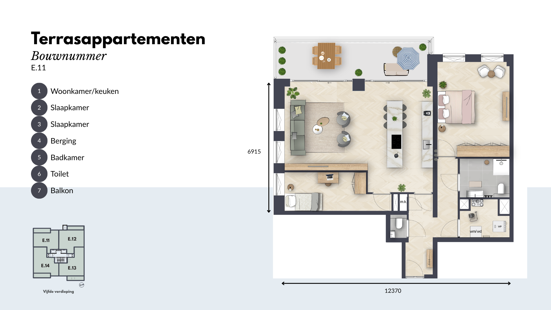 De Terrasappartementen beschikken over twee of drie ruime slaapkamers en een moderne keuken, uitgerust met hoogwaardige inbouwapparatuur. De luxe badkamer en separate toiletruimte zijn voorzien van hoogwaardig sanitair en tegelwerk. Daarnaast is er een ruime inpandige berging voor al je opslagbehoeften.