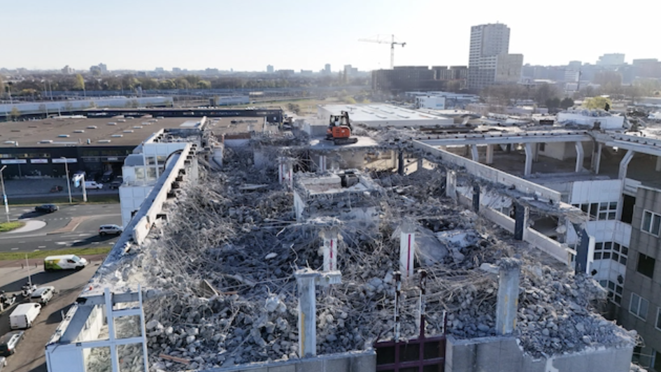 Martijn: We zijn op dit moment druk bezig met de sloop van het bestaande pand. Omdat we binnenstedelijk bouwen, aan het één na drukste kruispunt op de Binckhorst, is dit een uitdagend traject. De gemeente Den Haag hanteert strikte richtlijnen voor sloop- en bouwveiligheid om valgevaar op het openbaar gebied en naastgelegen pand te voorkomen. We mogen bijvoorbeeld niets slopen in de tijd dat de bushalte naast het pand in bedrijf is. Dit betekent dat we pas op vrijdag aan het einde van de middag tot en met zaterdag dit deel van het gebouw naast de bushalte kunnen slopen om iedere kans op letsel voor passanten te voorkomen. Om dit zo veilig mogelijk te doen, hebben we in samenspraak met Vermeulen Sloop- en Milieutechnieken gekozen voor ‘de Japanse sloopmethode’, waarbij we het gebouw met kleine kraantjes laagje voor laagje afbreken. Sloopmateriaal valt gecontroleerd naar binnen en wordt veilig via centrale schachten afgevoerd.