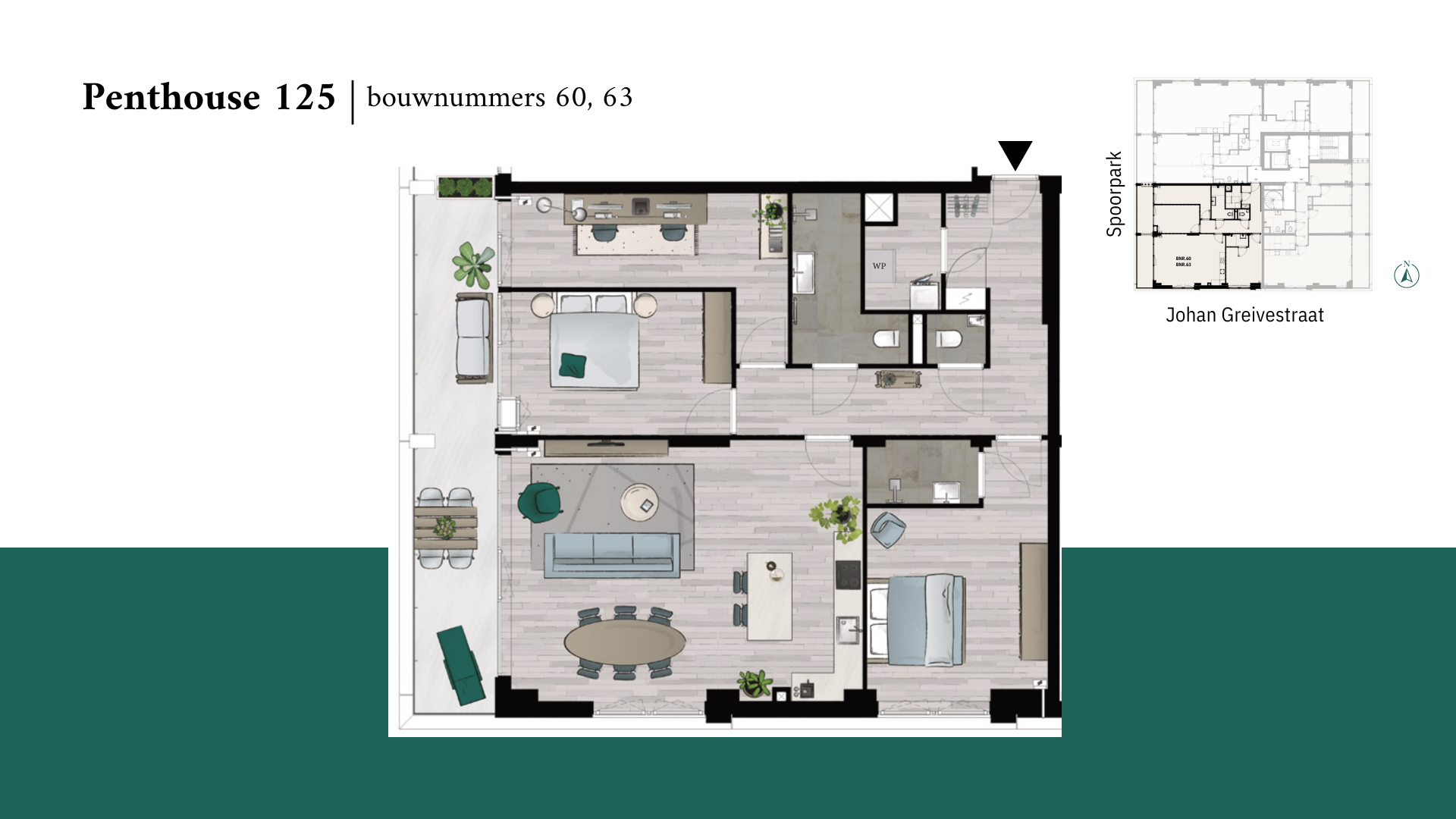 De luxe entree en gangzones, samen met de snelle bouwtijd, maken deze woning nog aantrekkelijker. De erfpacht is voor 50 jaar afgekocht, wat je financiële zekerheid biedt. De groene omgeving en het prachtige Spoorpark als integraal onderdeel van het ontwerp maken het Penthouse 125 tot een ideale woonplek.