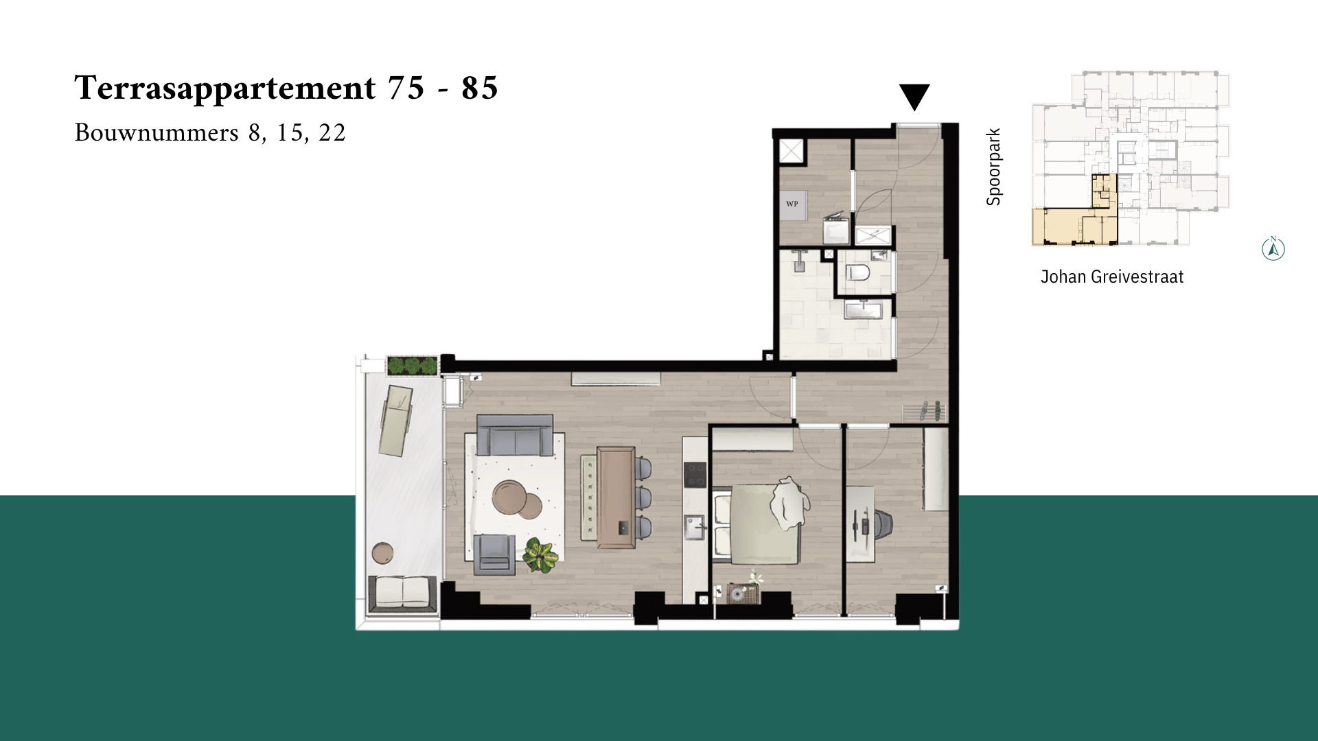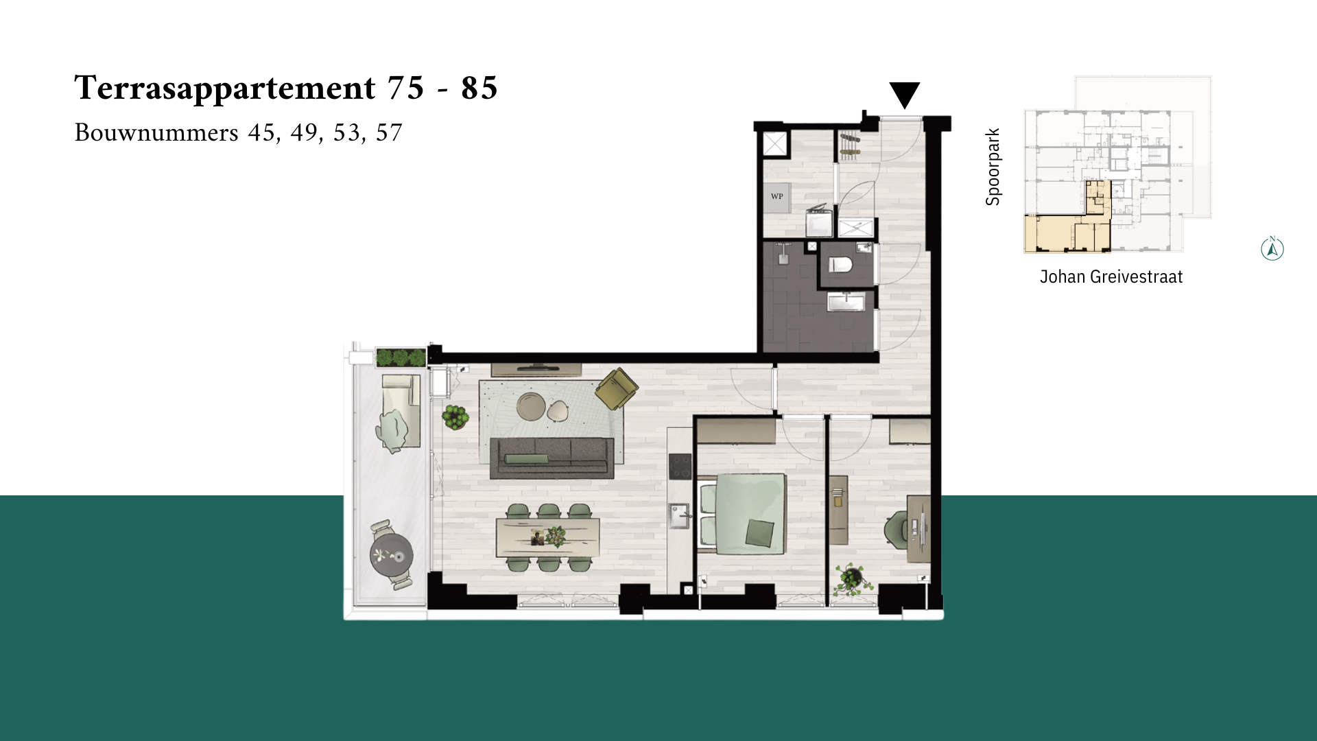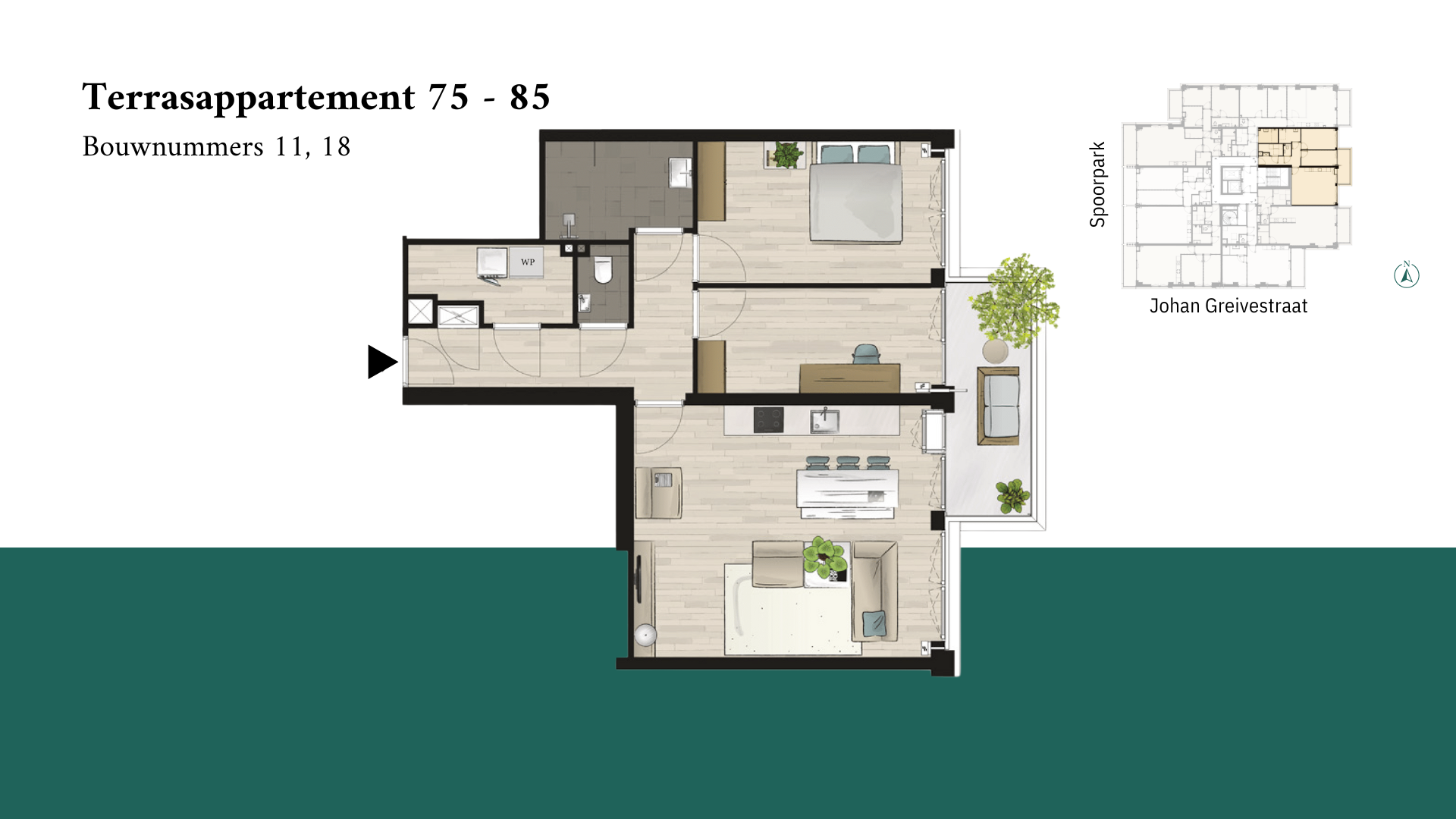 Met verschillende liggingen kun je kiezen uit een tussen- of hoekappartement en diverse mogelijkheden om je woning volledig naar je smaak af te werken. De erfpacht is voor 50 jaar afgekocht, wat je financiële zekerheid biedt. De groene omgeving en het prachtige Spoorpark als integraal onderdeel van het ontwerp maken het Terrasappartement 75 – 85 tot een ideale woonplek. De ruime woonkamer met grote raampartijen zorgt voor veel natuurlijk licht en een open, luchtige sfeer. De woning wordt geleverd met hoogwaardig sanitair, inclusief een separaat toilet, en je hebt de vrijheid om je keuken naar eigen smaak in te richten. Met een voorlopig energielabel A+++ en een geavanceerd warmte/koude systeem, geniet je van een comfortabele en duurzame leefomgeving. De luxe entree en gangzones, samen met de snelle bouwtijd, maken deze woning nog aantrekkelijker.