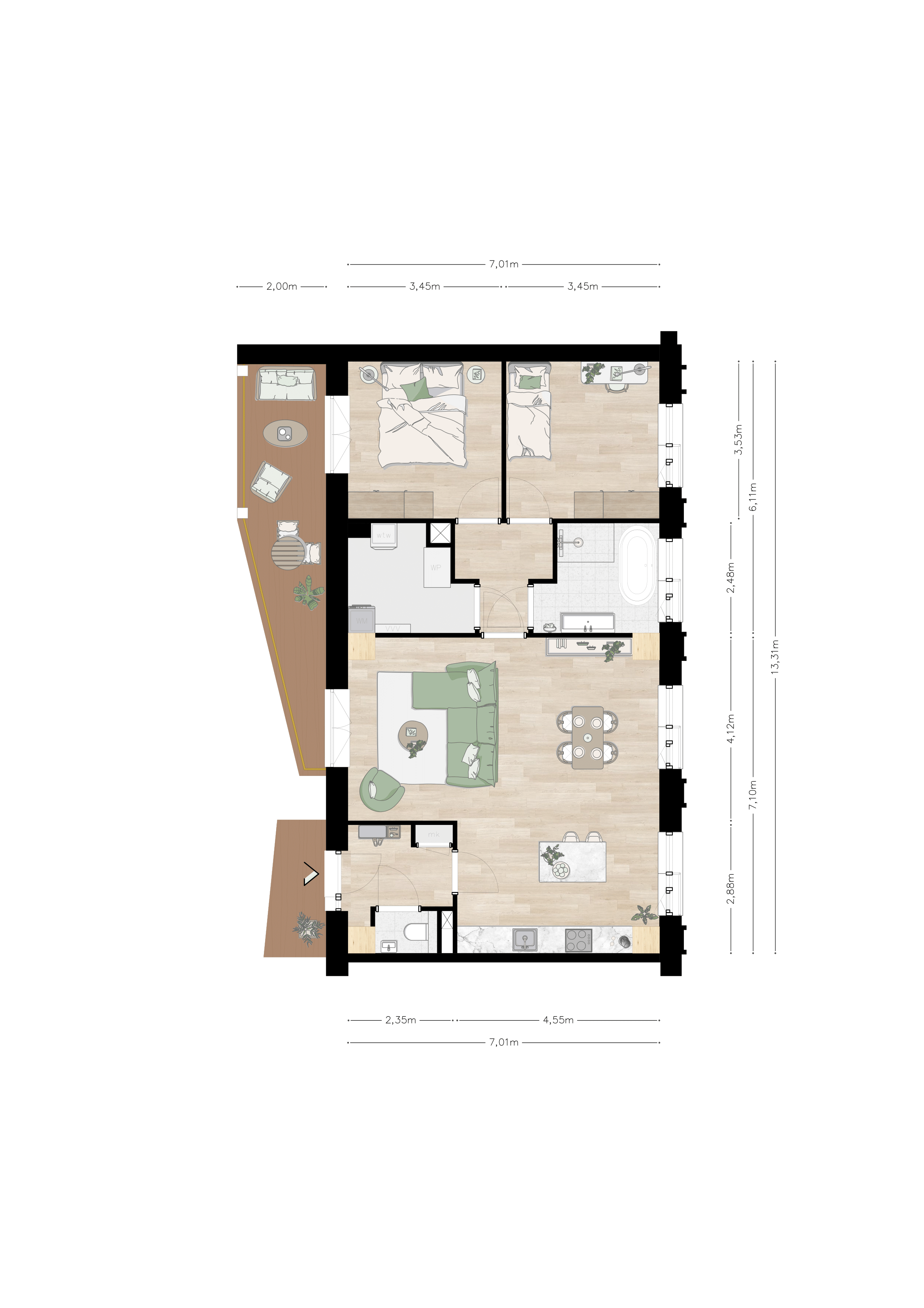 Ook GURiiN type C komt op alle vier de verdiepingen één keer voor. Dit is een 3-kamerappartement en biedt met 93 m2 alles wat je nodig hebt.