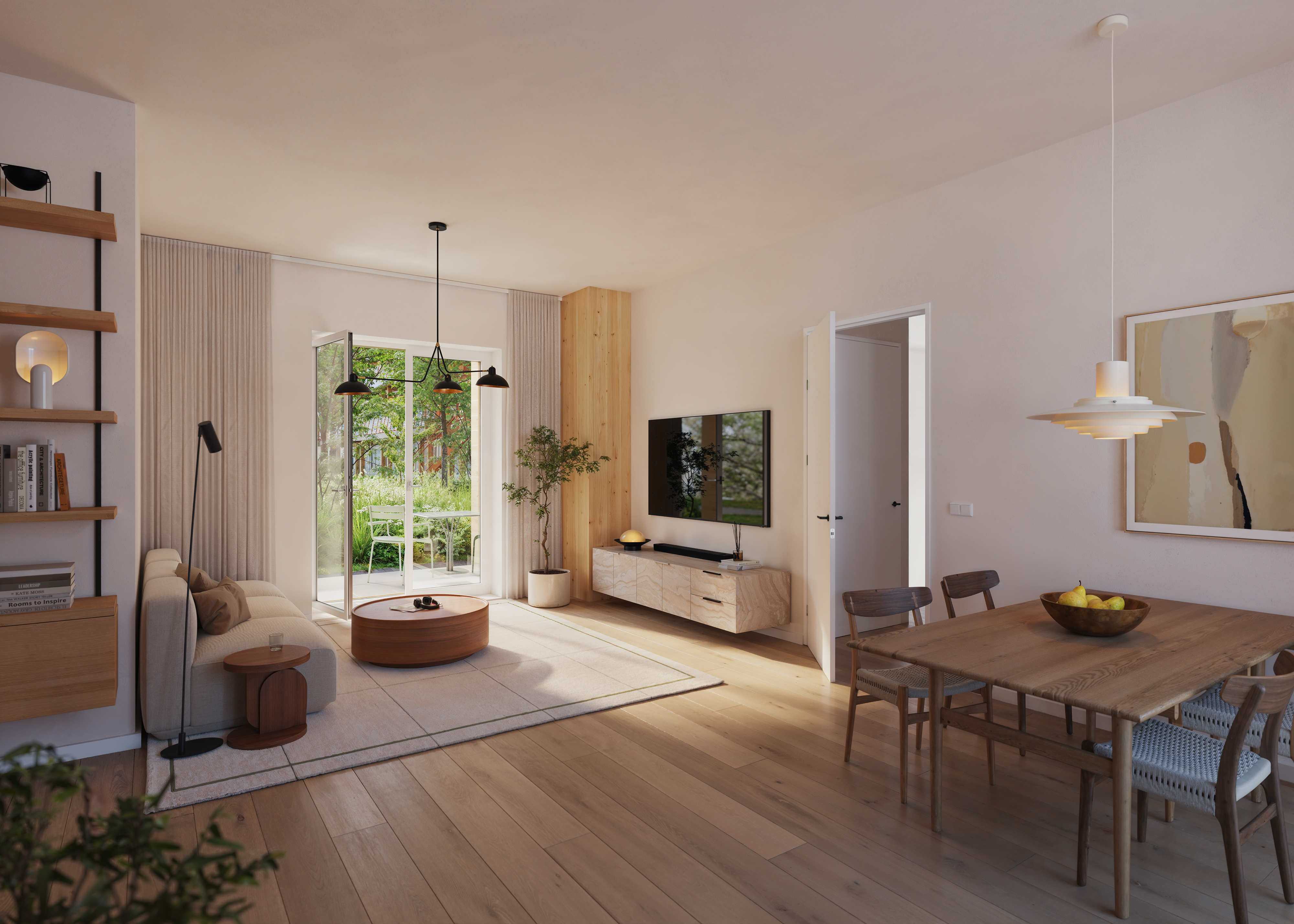 Wat voor een appartement vrij uniek is, is dat dit appartement een 'doorzon woonkamer' heeft. Hoe fijn is het om aan twee zijden van lichtinval te profiteren? Ramen aan de voorzijde en aan de achterzijde openslaande deuren die uitkomen op de Azobé-houten galerij van waar je uitkijkt over de mooie groene binnentuin.