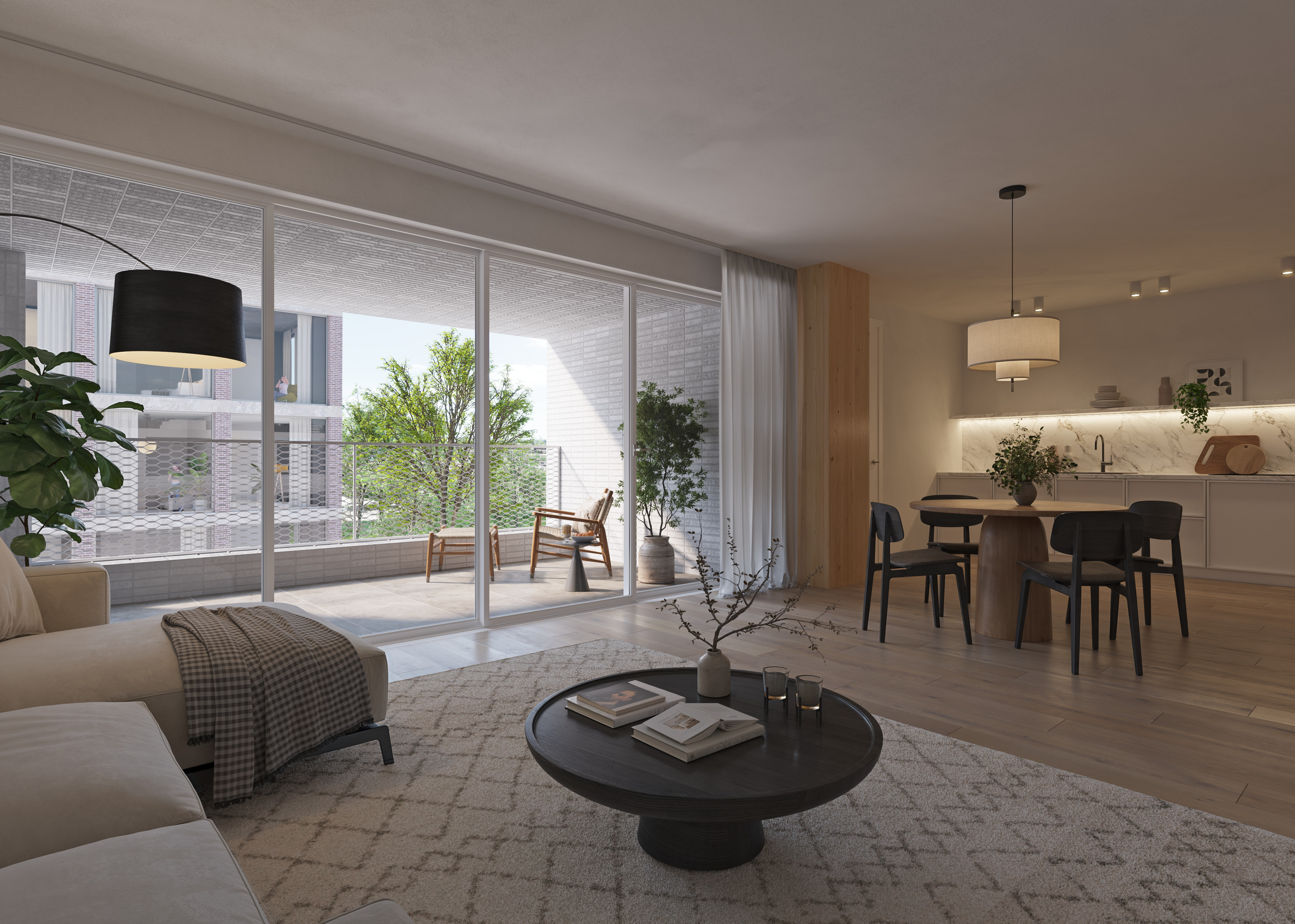 Op de interieurimpressie is dit woningtype afgebeeld met de optionele schuifpui. Kijk naar de interieurimpressie van MiGOTO type A / B om een indruk te krijgen van de standaard openslaande deuren.