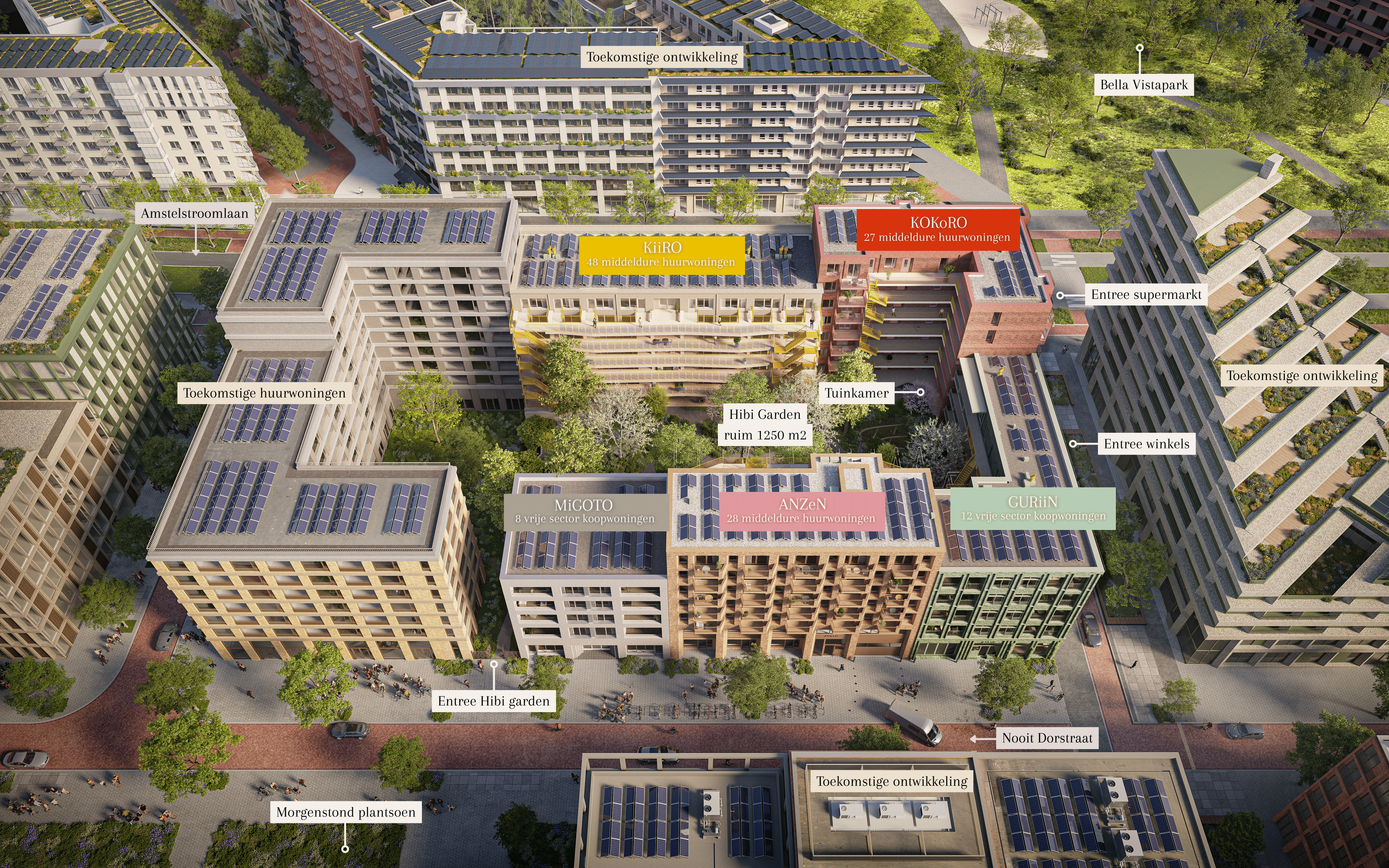 Aan de andere kant van Hibi vind je de Amstelstroomlaan. Dit wordt een levendige stadsstraat. Met kantoren, winkels en mogelijkheden voor bijvoorbeeld yoga, boksen of spinning. Plekken waar buurtbewoners en bezoekers elkaar ontmoeten. Franse balkons, erkers, zitjes en groen geven deze omgeving een afwisselend, robuust en bijna monumentaal karakter.