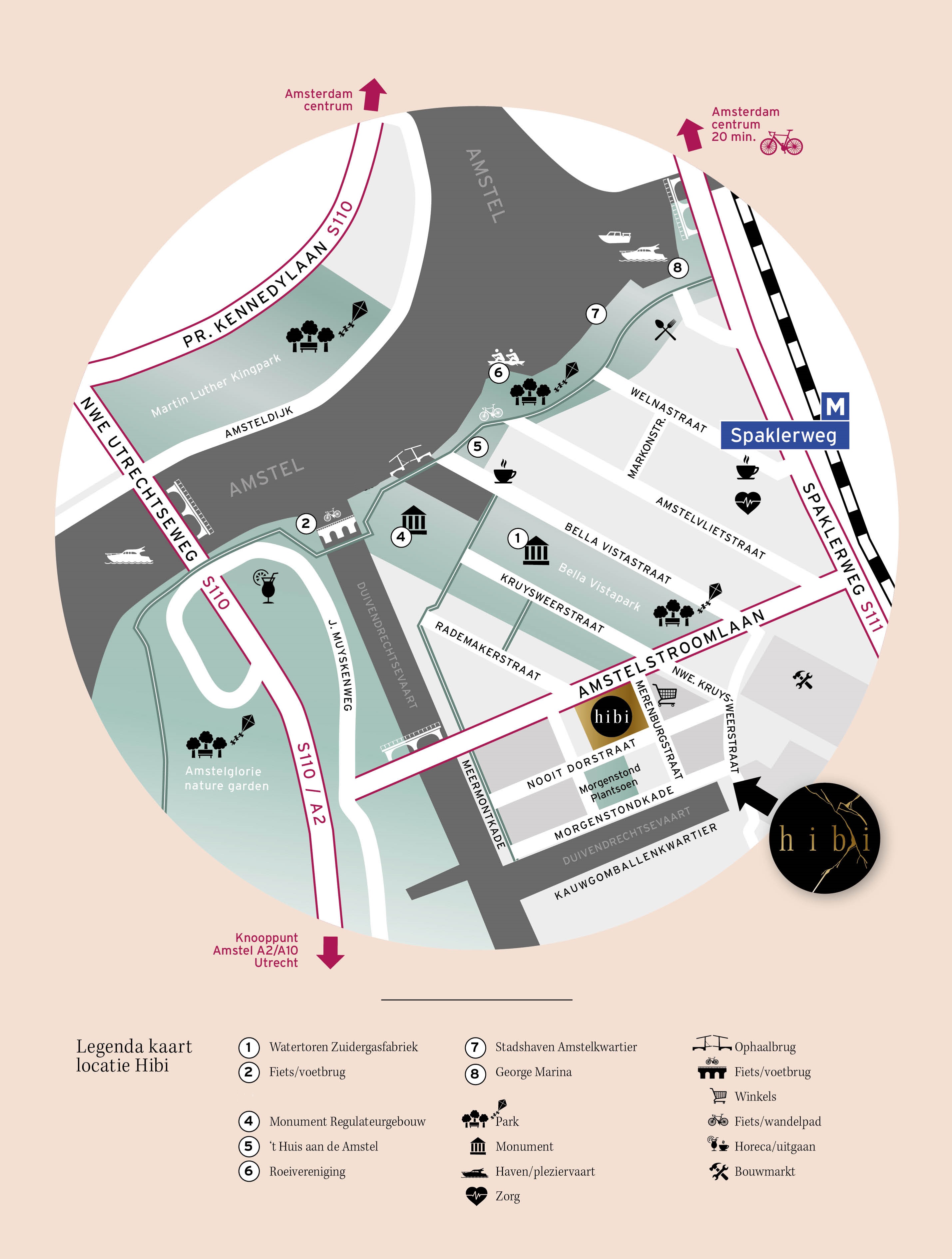 Hibi komt in het Amstelkwartier aan de Amstel in Amsterdam Oost. Op deze pagina lees je meer over deze leuke locatie en zie je ook het bijbehorende locatiekaartje. Bij 'de situatie' zoomen nog wat dieper in en helemaal onderaan deze pagina bekijk je gemakkelijk je bereik per voet, fiets, auto of OV binnen een bepaalde tijd.