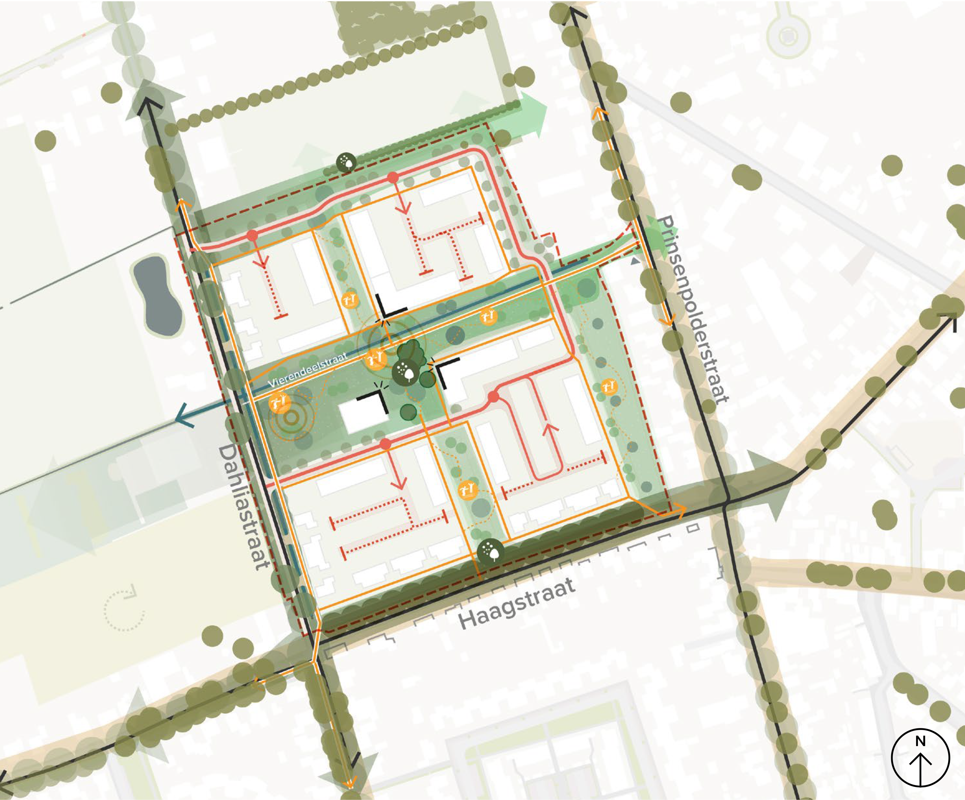 Het groen-blauwe raamwerk vormt de basis van de wijk en is ontworpen om mee te bewegen met het klimaat. Door natuurlijke waterberging in wadi’s en retentiezones wordt regenwater op een slimme manier opgevangen en vastgehouden. Grote bomen zorgen voor schaduwrijke plekken en verkoeling tijdens warme zomerdagen, terwijl het groen ruimte biedt aan natuur en biodiversiteit. Veilige, groene wandel- en speelroutes maken de wijk prettig en toegankelijk voor alle leeftijden. Elke woning wordt omringd door openbaar groen, waardoor je dagelijks leeft in een rustige, natuurlijke setting.