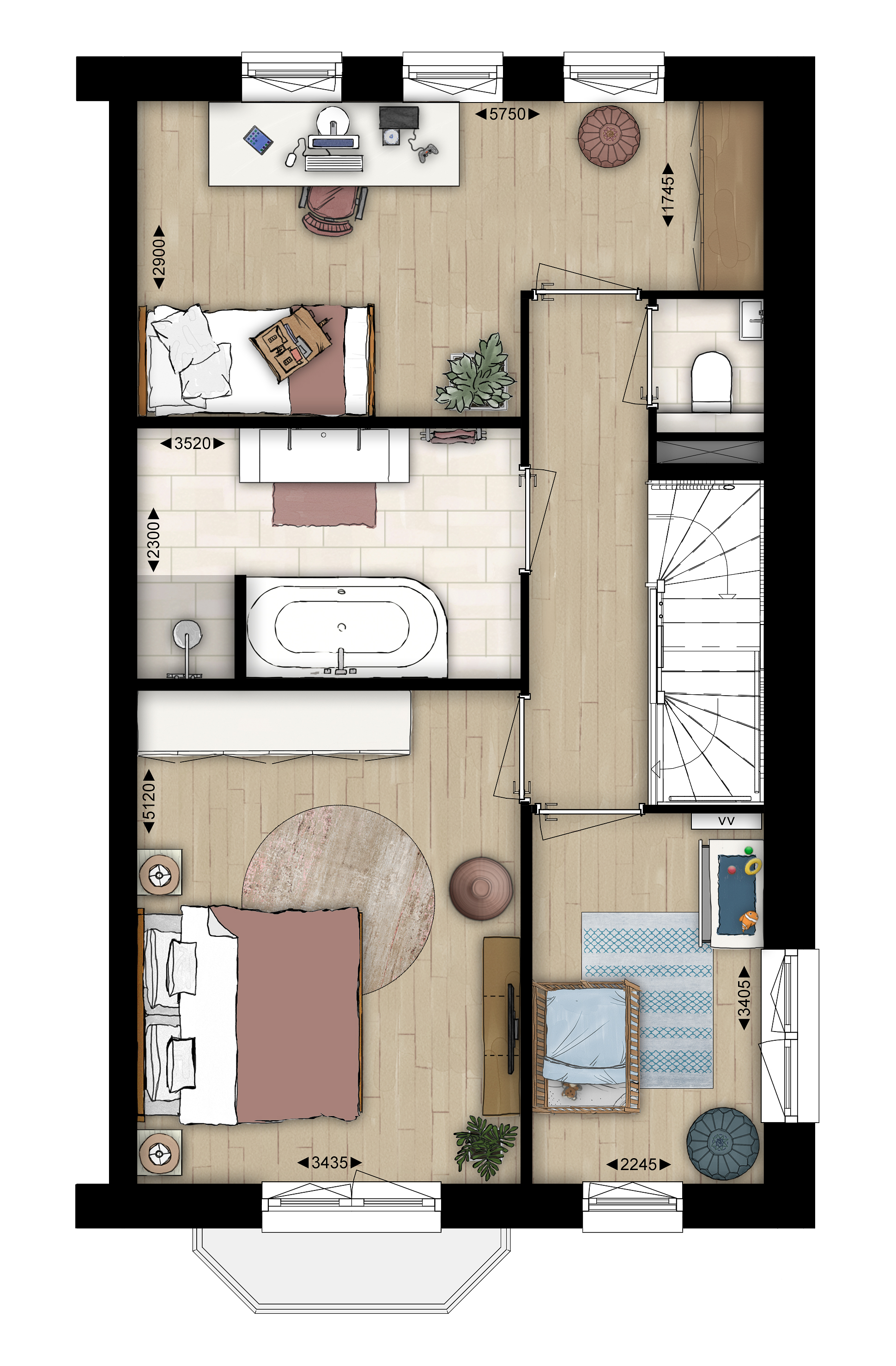 - Sfeerplattegrond optie 1e verdieping met grote badkamer en separaat toilet