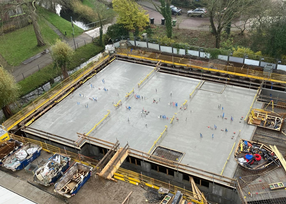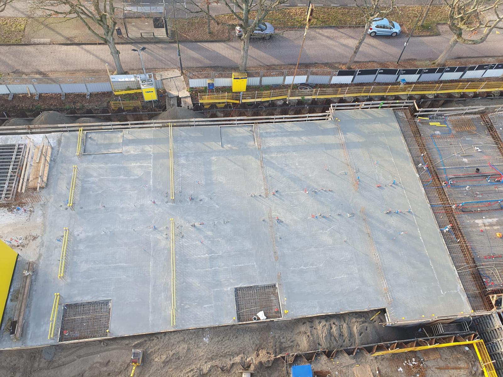 Na de vorige bouwupdate zijn we volop verder gegaan met de funderingen van het gebouw en is op 9 oktober het 1e deel van de keldervloer gestort. De keldervloer wordt na het storten glad gemaakt met zogenaamde ‘vlindermachines’ zodat er een mooie gladde vloer ontstaat voor de fietsenberging en stallingsgarage. Eind oktober hebben we het laatste gedeelte kunnen storten inclusief de hellingbaan. Hieronder ziet u een foto van de keldervloer (met daarop twee 'vlindermachines').