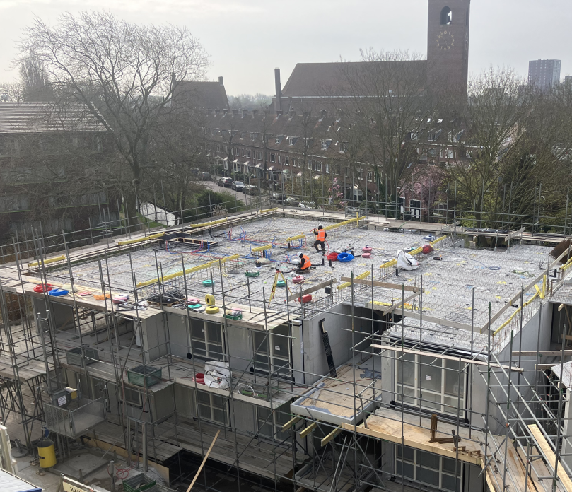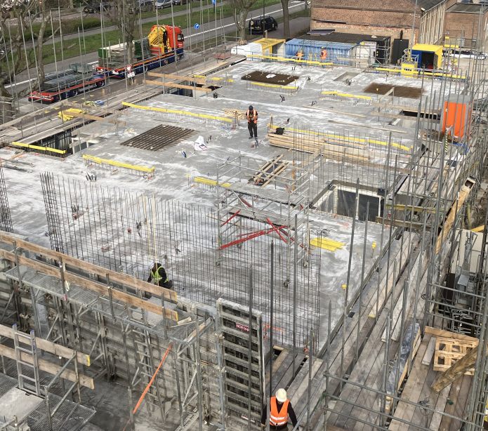 Dankzij de inzet van alle betrokken partijen ligt het project goed op schema en houden we een mooi bouwtempo aan. Als deze lijn zich voortzet, verwachten we dat het betonnen casco half mei gereed is. Vervolgens starten we met het aanbrengen van de kapconstructie, zodat het gebouw wind- en waterdicht wordt en we binnen kunnen beginnen met de afbouw.
