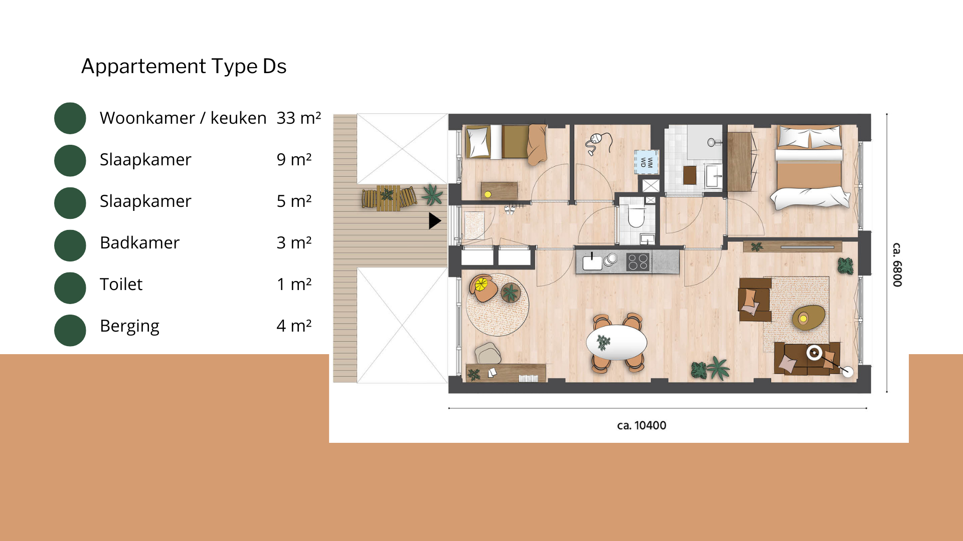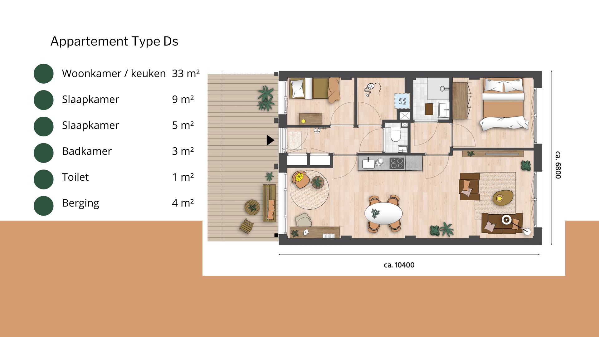 Type Ds – bouwnummers 7, 14, 21 en 28 – hebben energielabel A++ en bevinden zich op de eerste tot en met de vierde verdieping. Met een woonoppervlakte van circa 66 m² en een buitenruimte van ongeveer 5 m² op het zuidoosten, bieden deze woningen veel comfort. Bouwnummer 7 heeft een grotere buitenruimte van circa 15 m² gelegen op het zuidoosten. De ruime lichte woonkamer is voorzien van een moderne keuken. Daarnaast beschikken de woningen over twee slaapkamers, een compleet ingerichte badkamer en een separaat toiletruimte. Er zijn drie fietsparkeerplekken beschikbaar.