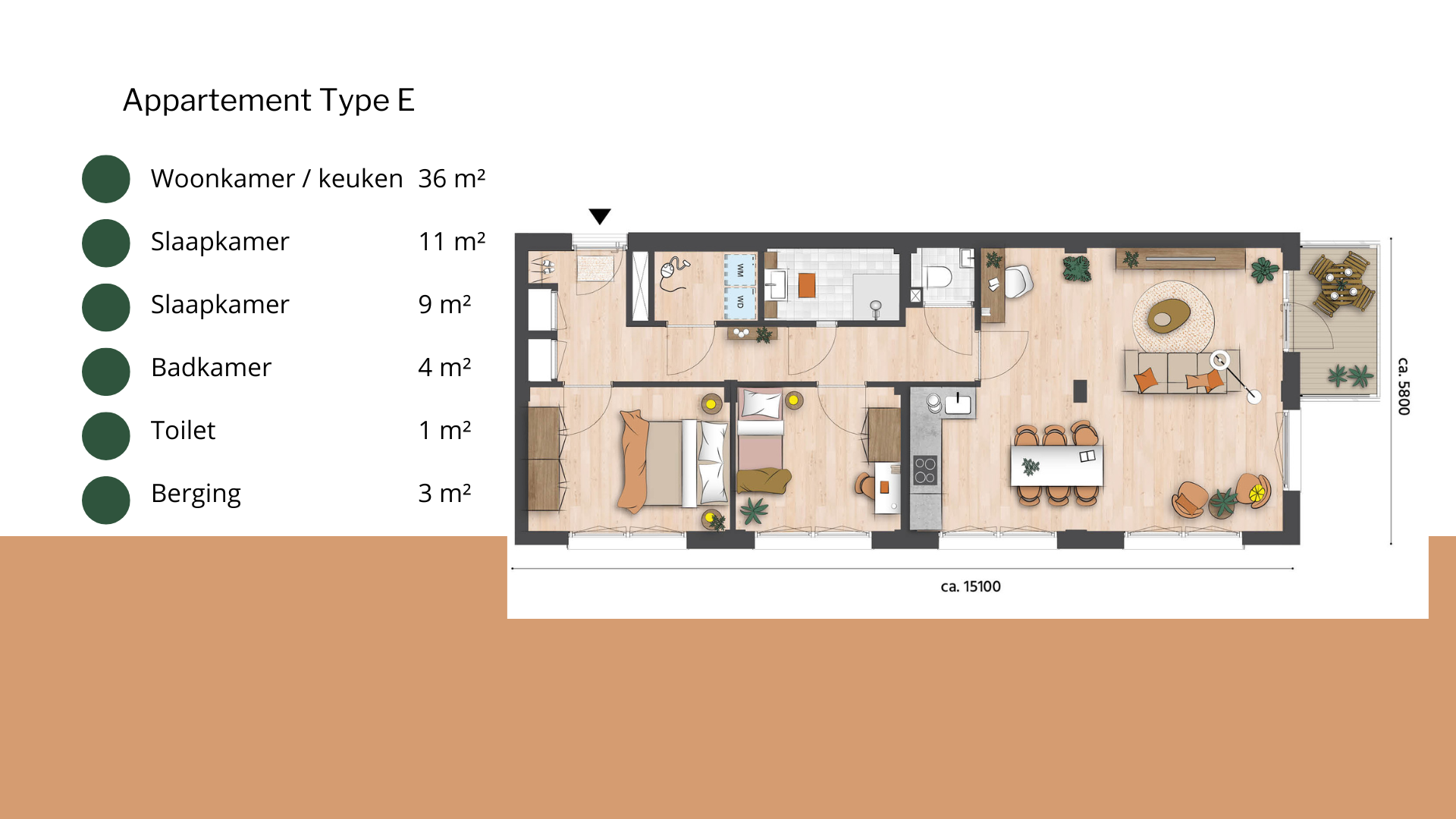 Type E - bouwnummers 8, 15, 22 en 29 – hebben energielabel A+ en zijn gelegen op de eerste tot en met de vierde verdieping. Deze woningen hebben een woonoppervlakte van circa 79 m² en een buitenruimte van ongeveer 4 m² met een oriëntatie op het noordwesten. De fijne woonkamer is voorzien van een moderne keuken. Verder beschikken de woningen over twee slaapkamers, een compleet ingerichte badkamer en een separaat toiletruimte. Er zijn vier fietsparkeerplekken beschikbaar.