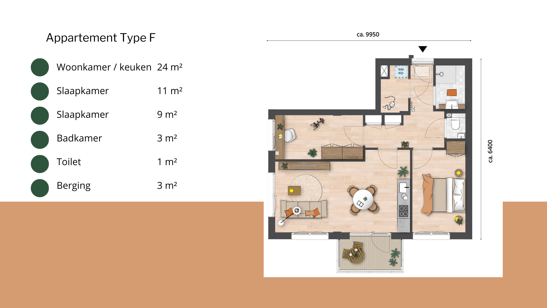 Type F – bouwnummers 9, 16, 23 en 30 – hebben energielabel A of A+ en zijn gelegen op de eerste tot en met de vierde verdieping. Deze woningen hebben een woonoppervlakte van circa 63 m² en een buitenruimte van ongeveer 5 m² met een oriëntatie op het zuidoosten. De fijne woonkamer is voorzien van een moderne keuken. Verder beschikken de woningen over twee slaapkamers, een compleet ingerichte badkamer en een separaat toiletruimte. Er zijn vier fietsparkeerplekken beschikbaar
