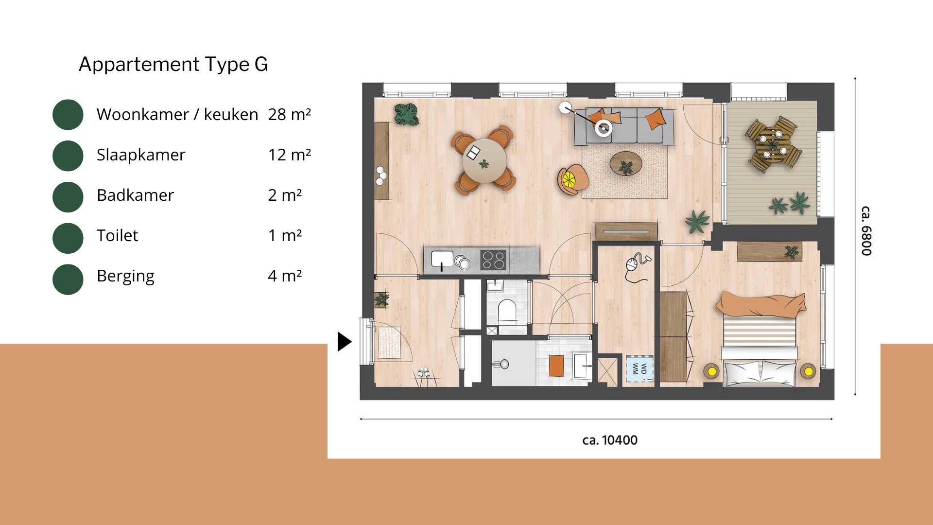Type G – bouwnummers 31 en 35 – hebben energielabel A+ en bevinden zich op de vijfde en zesde verdieping. Met een woonoppervlakte van circa 57 m² en een buitenruimte van ongeveer 6 m² op het westen, bieden deze woningen een comfortabele leefomgeving. De ruime woonkamer is voorzien van een moderne keuken. Daarnaast beschikt de woning over een ruime slaapkamer, een compleet ingerichte badkamer en een separaat toiletruimte. Er zijn twee fietsparkeerplekken beschikbaar.