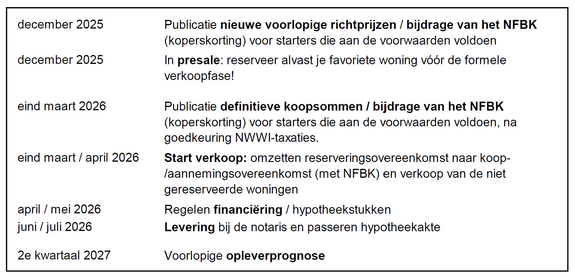Op dit moment zijn druk bezig met het maken van alle afspraken en contracten met het NFBK, we verwachten dat dit eind maart / april 2026 geformaliseerd zal worden, waarna we in formele verkoop te kunnen gaan met de woningen. Uiteraard worden de woningen met een reservering dan niet meer op de markt gebracht, deze reserveringen worden dan omgezet naar een koopcontact.