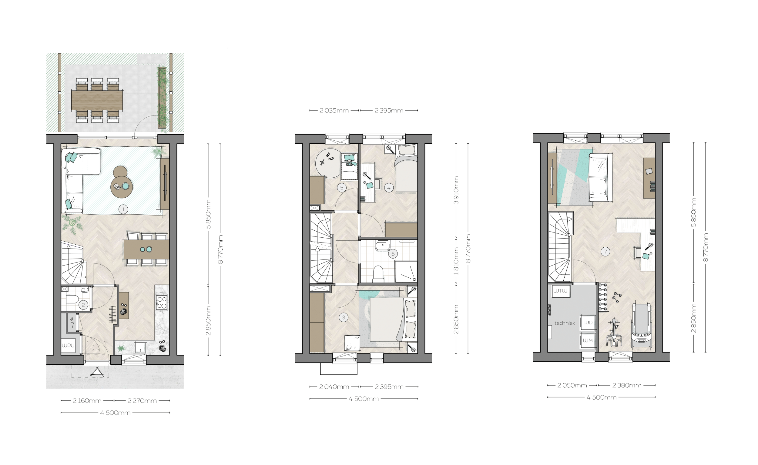 Op de eerste verdieping bevinden zich drie comfortabele slaapkamers en een ruime badkamer. De tweede verdieping biedt nog meer mogelijkheden: een grote zolder met een afgescheiden technische ruimte. Hier kun je eenvoudig extra kamers of een thuiskantoor creëren, helemaal naar eigen wens.